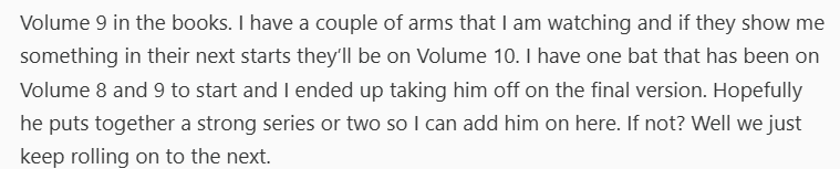 Get it when it shows you something and hold on. These arms are all showing something. If you can only grab one, I’d grab May. If I could only grab two, I’d grab May and Marquez. Marquez looks like he has a bit more life on his fastball than Huang at this point.
