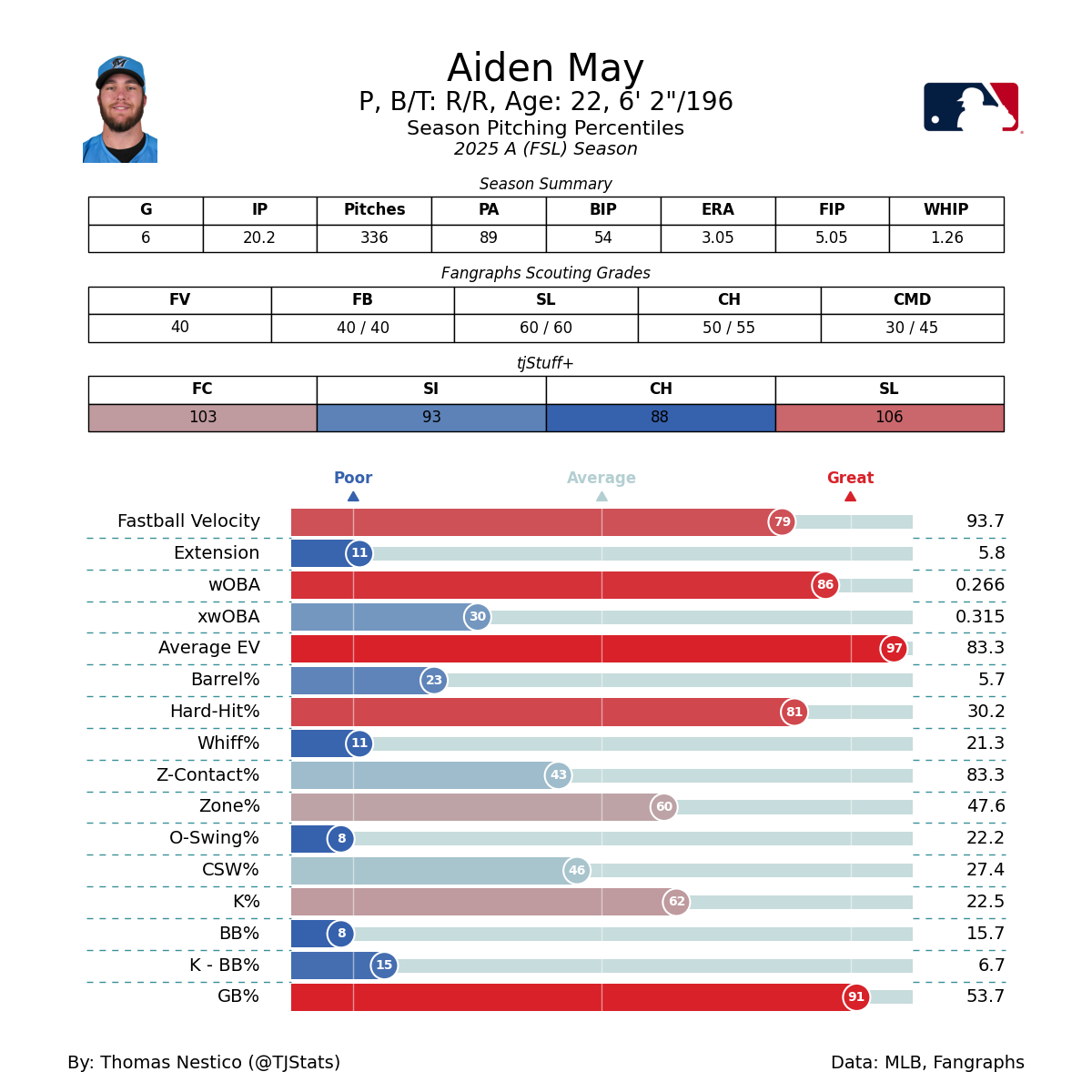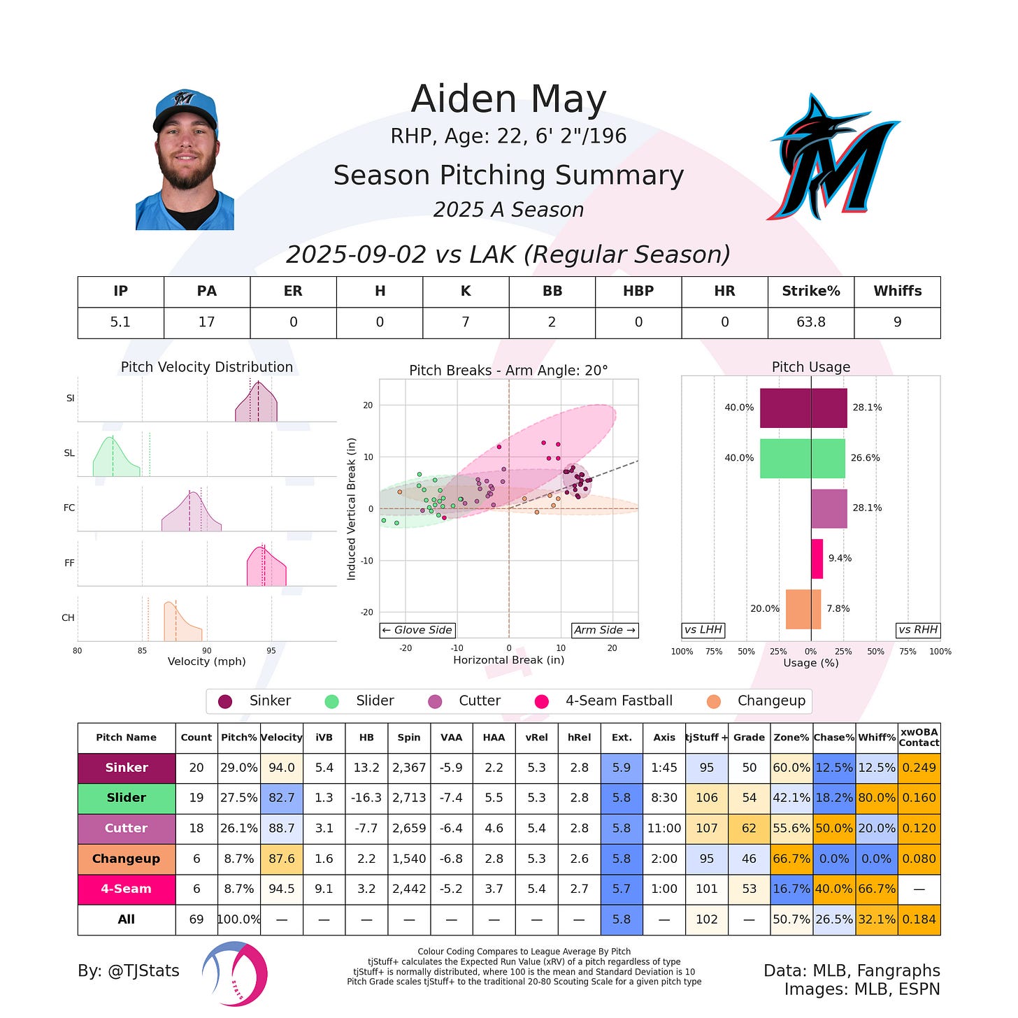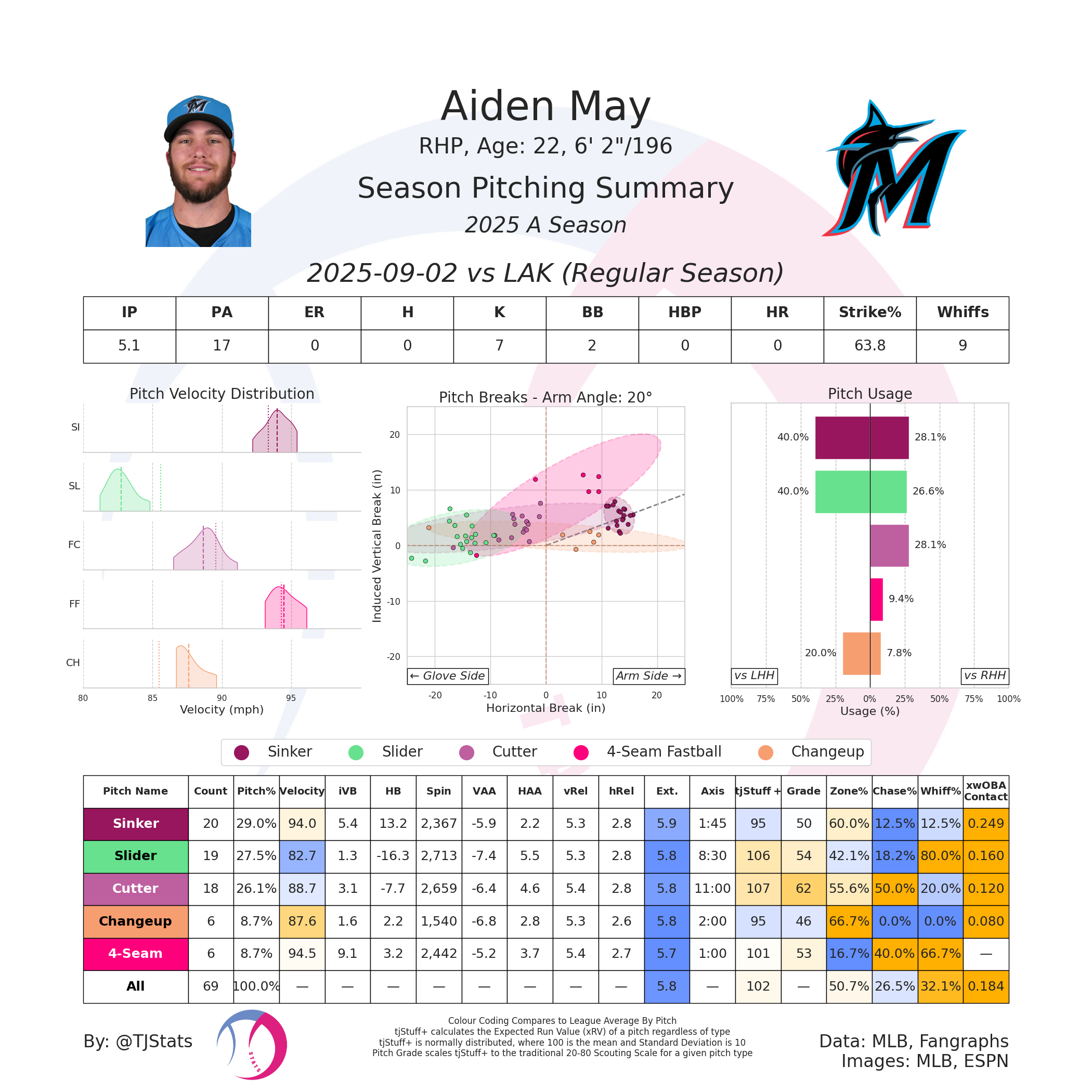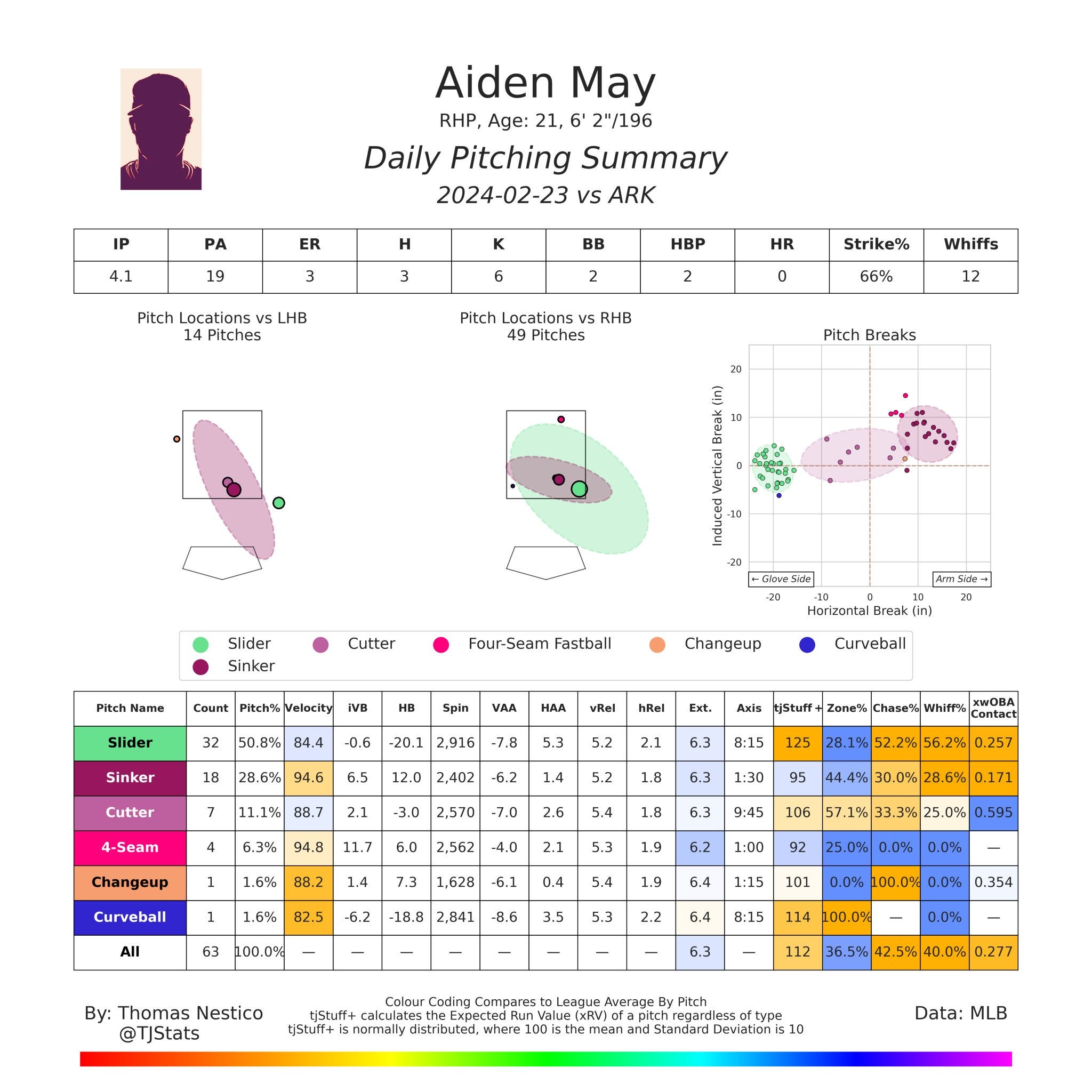 Aiden had arthroscopic elbow surgery to remove loose bodies in March, so we didn't get a chance to see him until he popped up at the complex in July. He made 4 appearances for a total of 6.2 innings, with a 68% No Hope % and a 15.8% swinging strike rate. He was promoted to Low-A on July 30th.
